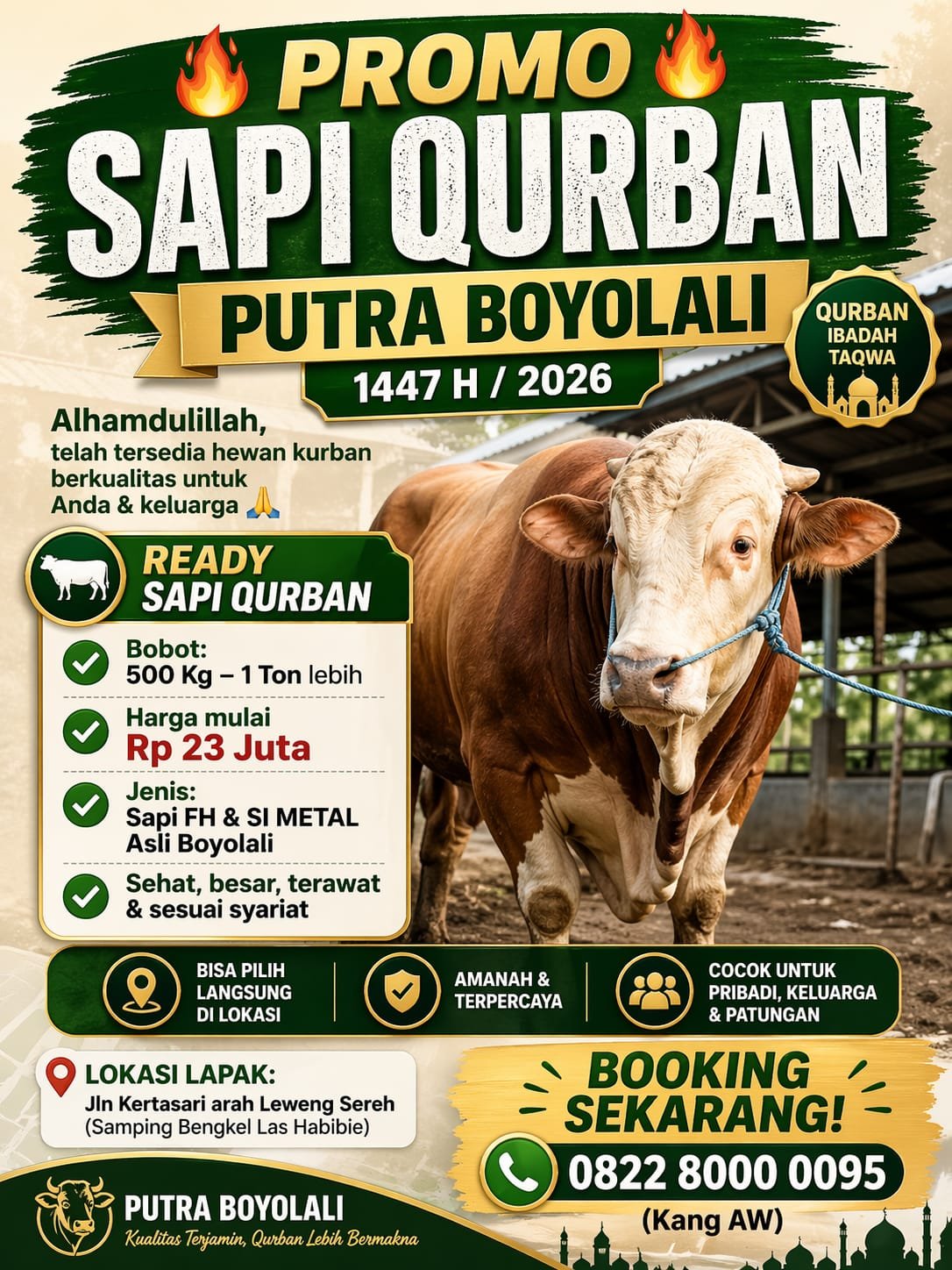 Ia juga memastikan seluruh sapi yang dijual dalam kondisi sehat, terawat, dan memenuhi syarat sah untuk ibadah kurban sesuai syariat Islam. Pembelian dapat dilakukan secara individu maupun secara patungan.